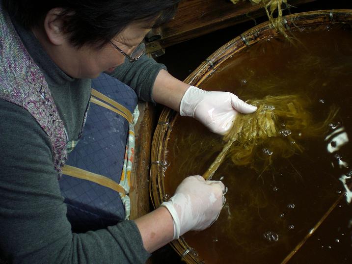 The customer wants less-white kozo paper. So we didn't wash the material several times as usual, so, soda ash, which is used when you cook kozo, is still with the material and would damage Hana-chan's hands.