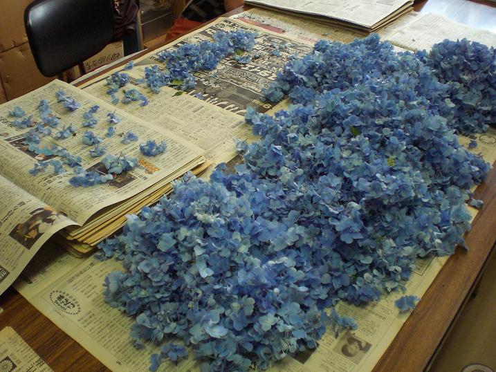 At Papyrus House, they are pressing petals of hyndrangea between newspapers.