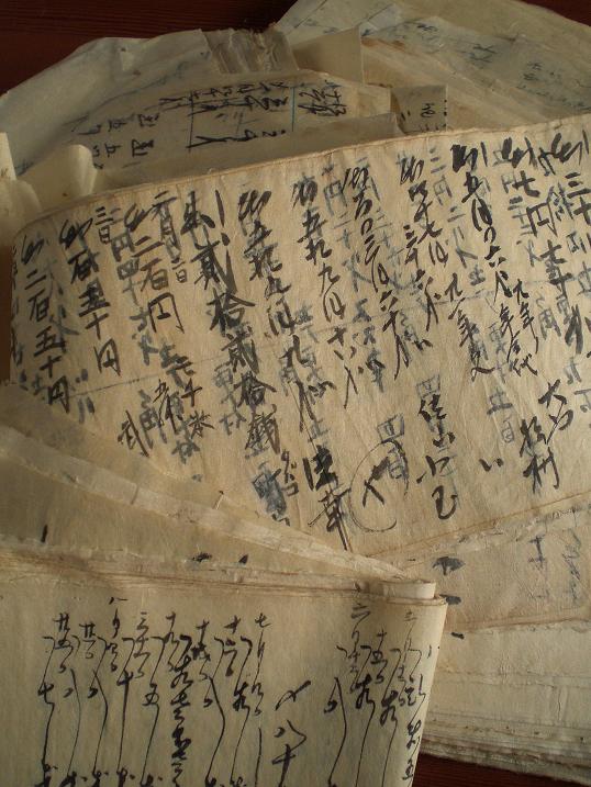 My next door neighbor used to make paper door, or fusuma in Japanese. Those papers in the picture were used to put under the paper door. You can see some numbers or prices in Chinese characters.