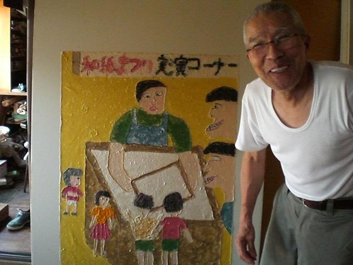 Behind him, there were several big pieces of paper art made by local grade school students. They make those art piece every year for their graduation.