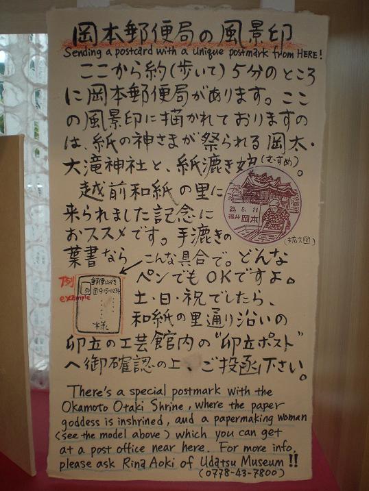 What I'd like you to know is that you can send a post card with a special stamp mark described paperlady and the Shrine from our local post office. I know that few people send letters and post cards, but please try. That will surely make your friends or families very happy.