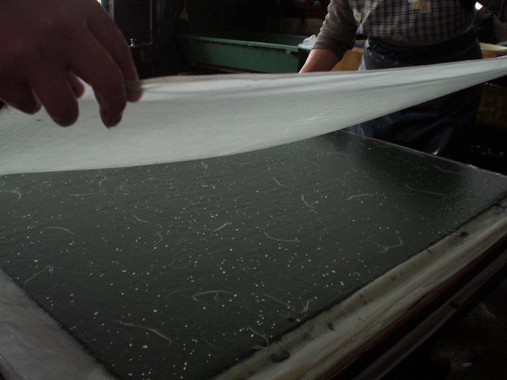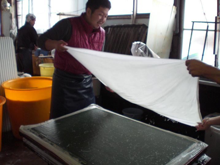 But today I could take some at Jiyomon Paper Studio where I work. The two artisans were making paper in the traditional way; using cloth and pressing paper to drain water. You need a cloth in between.