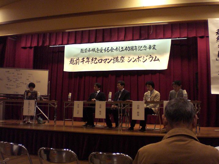 Last night there was a symposium held by a group called ` We Love Echizen Washi ` ( this might be a very strange translation ! but you can guess who to be its members ... ). Four panelists and one female chairman were discussing how Echizen Washi can become wel-known and wel-used paper both in Japan and in the world.