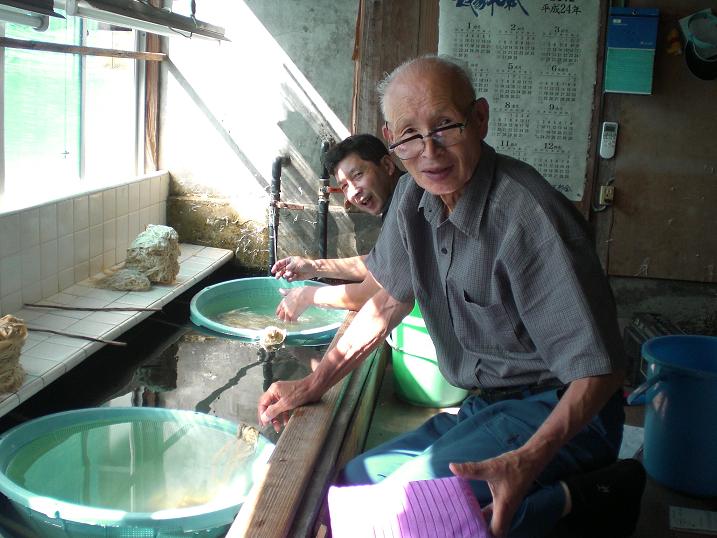 ( photo 1 : He was checking kozo fiber with his son the other day when I visited him alone. )