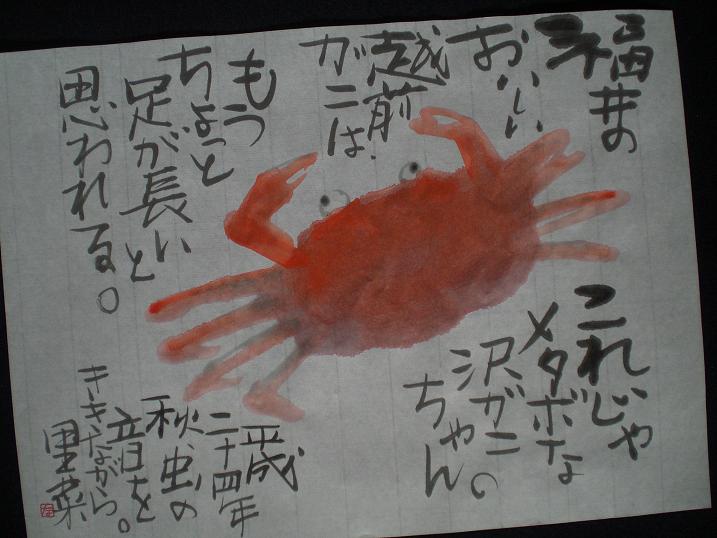 Echizen crabs ....... Usually every November fisheries here are allowed to catch them until the next year February. The crabs are well known in Japan for their good taste. I think they look also cool to have long legs ; ) . Let me try to draw one ! ....... it doesn't look like Echizen one with his round body.....