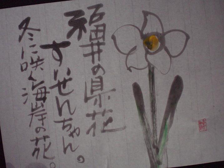 Narcissuses ..... Each prefecture in Japan has its own flower. Narcissuses are Fukui's because they bloom in winter time along the sea coast, which is known as the seasonal scenery. Let me try again .... does it look like the real ? Maybe the number of the petals is wrong !?