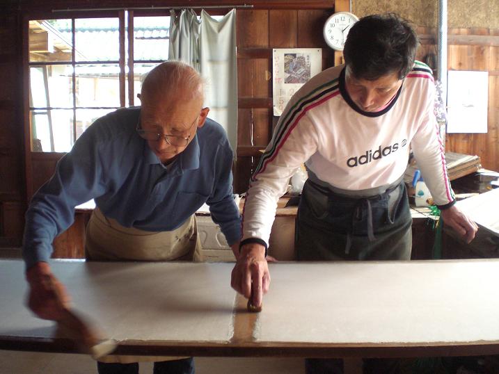 Mr.Ichibei Iwano ( 79 ), the 9th of the Iwanos and the living national treasure in papermaking, and the son ( 47 ) , the 10th are putting wet papers on the wood board to be dry. The family has about 300 years history. Mr. Ichibei's father was also designated as a living national treasure in 1968.