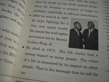 It was a story about Jackie Robinson who was the first player in the Major Leagues as a black person. In the end of the story it goes, ` He died in 1972. His life really had a strong impact on many people. The value of a life is measured by its impact on other people. That is the message that he left for us. `