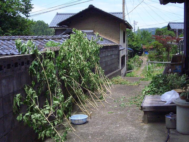 My `wild` mulberries were disturbing people passing the path, so I decided to cut them to make paper ( They are wild because it started growing suddenly a few years ago, first one branch, three, five ..... ). Usually Kozo for papermaking is cut every year in fall, but I couldn't wait until fall !