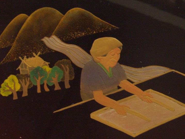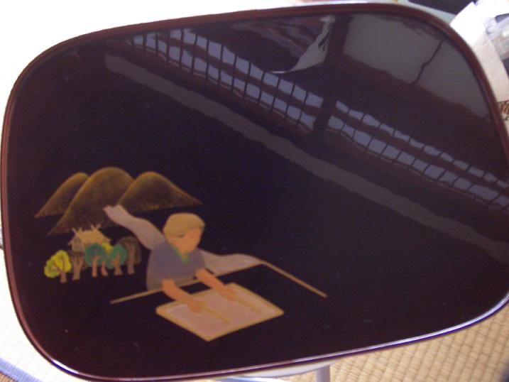 This is beautiful tray made from natural lacquer and I made the picture scattering powders and adding lacquer; the Okamoto Otaki Shrine and a paper woman !