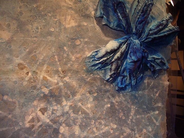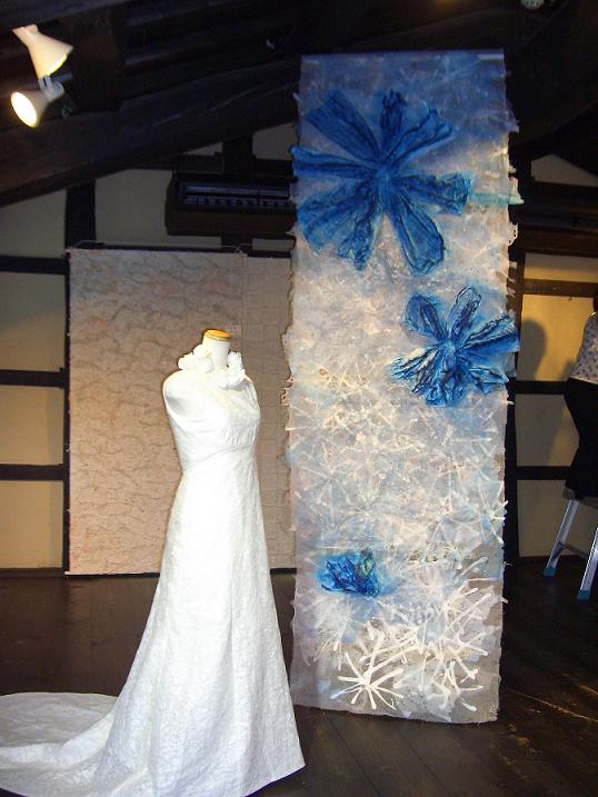 The blue work of mine is arranged here behind a wedding dress. The opening is on July 13th at Udatsu Museum.