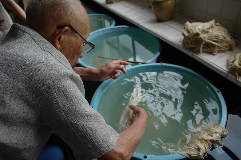 He was checking kozo material using water from the mountain just behind the studio. The water keeps flowing. In winter time, it's of course very cold, but they don't add hot water in there.