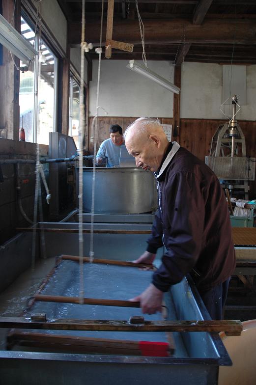 ( Mr. Ichibei Iwano papermaking, his son Jyunichi Iwano beating kozo )