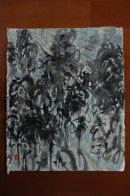 I felt something different in paper. It didn't really absorb ink. Using washi made in the village, I try to tell the artisans what I feel with paper. Of course, I don't know if my words are worth considering for them, but at least they can be something for them.