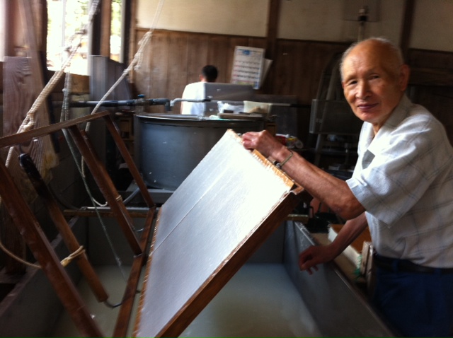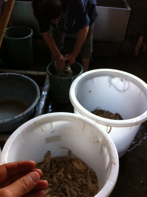 In summer it's not easy to have good ` neri` , tororoaoi, because of the heat. Ms. Iwano was preparing neri when we were visiting. Usually artisans use only one kind of neri, but for his papermaking they use two kinds of neri; tororoaoi and noriutsugi. The latter is produced in Hokkaido, nothern Japan !