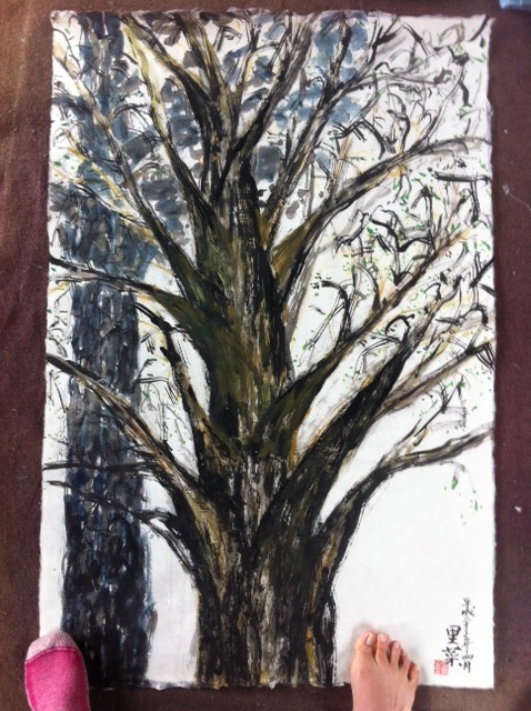 Putting the paper directly onto the ground, I did a quick sketch with ink and brush. Very fast one.