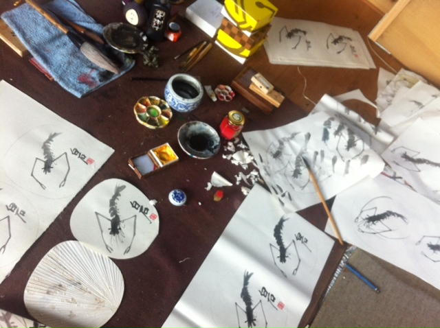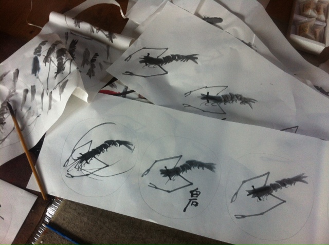 I was asked to paint his famous shrimp on a fan.....