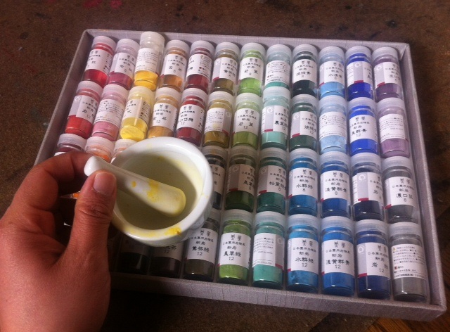 Using Japanese natural pigment. I'm sure I'm not following its traditional method to smash the pigment mixing with glue.....