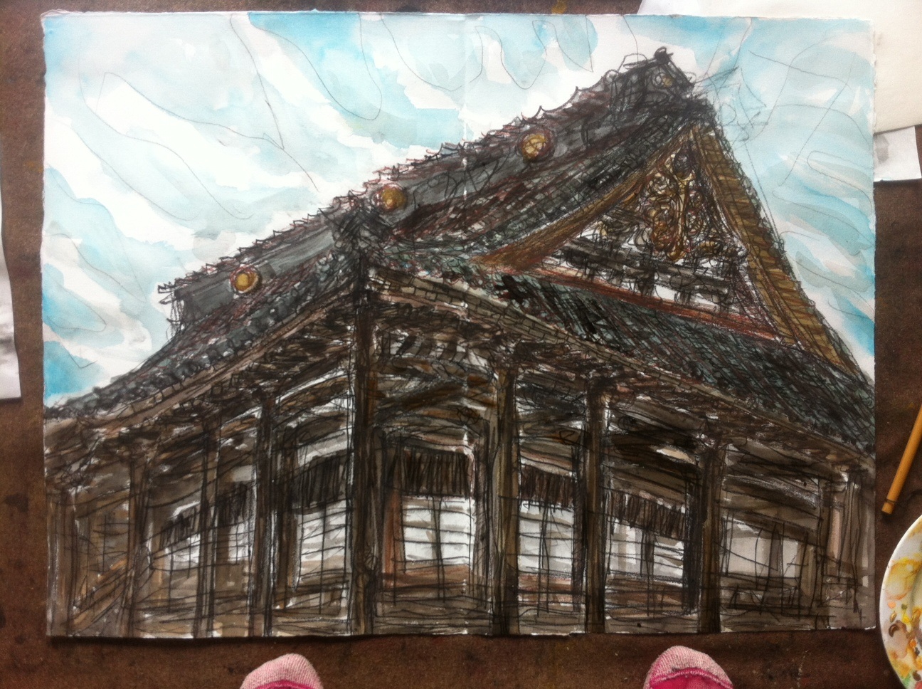 Coming home , I added some colors. Somehow maybe I have tried to make it something people might like or people can recognize it is the temple. Not good. I'll try ink now.