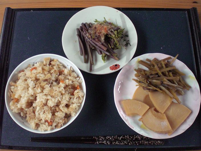 It is very simple meal, but very healthy. Someone told me that you can survive hot and humid summer in Japan if you eat the wild vegetables in spring, which are very nutritious with its harshness.