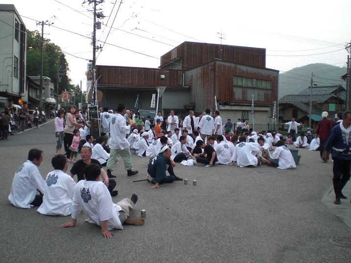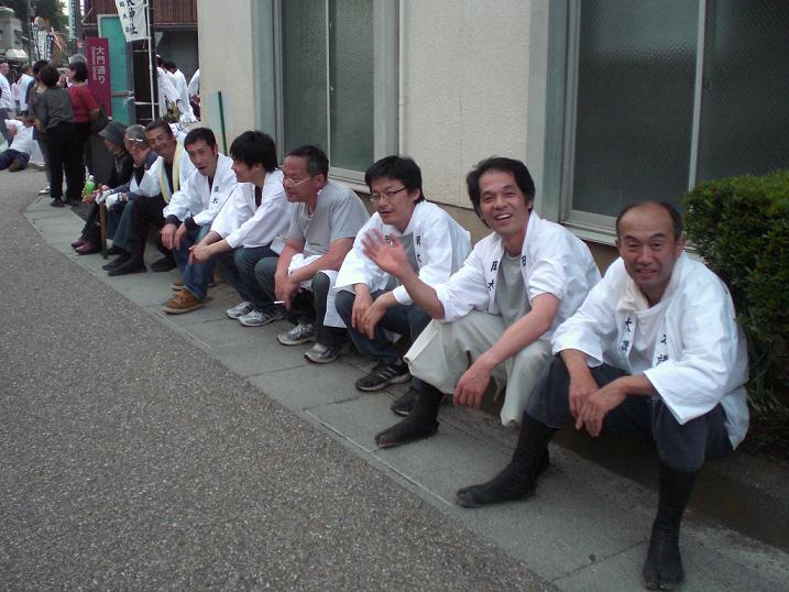They carry the mikoshi, portable shrine, drinking beer every time they make a brief stop served by the local people.