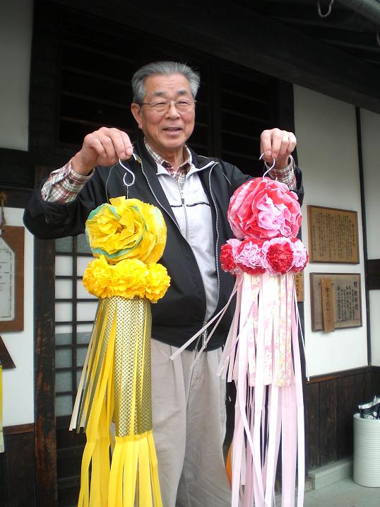 Mr.Kono of Udatsu Museum is holding the decorative papers.