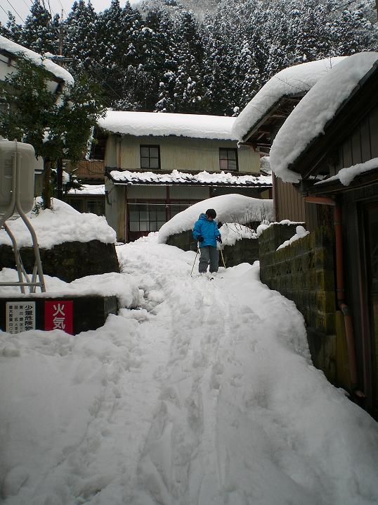 It's pretty sunny today and you can see the blue sky here. I couldn't think of skiing in this narrow street, but it's a good idea, isn't it .