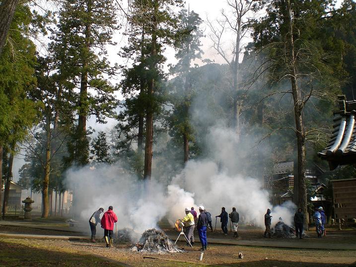 Last Sunday people in the village were cleaning Okamoto Otaki Shrine. This winter we had a lot of snow, so many branches of the trees were broken down and left in the field.