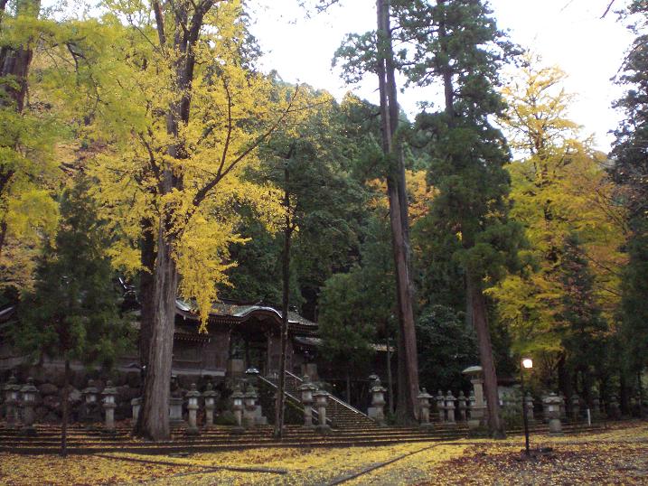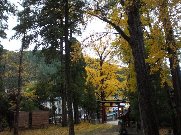 There was a yellow carpet inside of the shrine. Leaves are falling off from the branches.