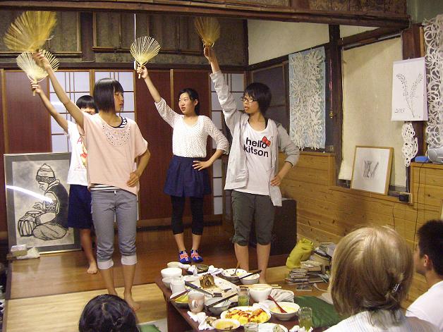 I asked the girls if they could show us how they had danced at the festivals inside of the shrine when they were 12 years old. Only girls who are in that age dance it. It was very nice of them to accept my sudden offer to demonstrate the dance using incomplete bamboo fans.