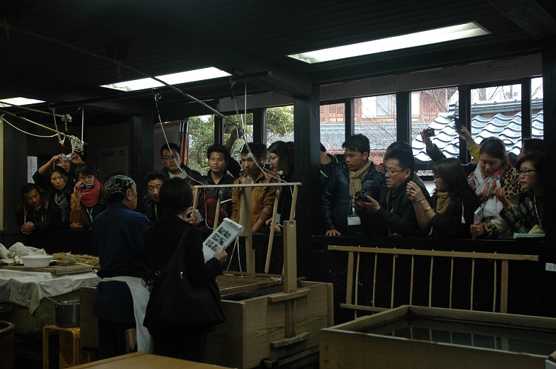 Mr.Hisashi TAMAMURA was explaining Echizen papermaking to the people from Butan the other day. There was a interpreter and I was very curious how she would translate papermaking without her own papermaking experiences. It was in English.