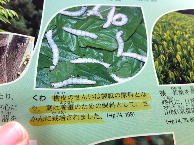I have the same textbooks with the ones my students use at school now. Their history book explains kozo, mulberry, as a materials for papermaking and weaving textile. It says the peals for papermaking and leaves for sericulture.