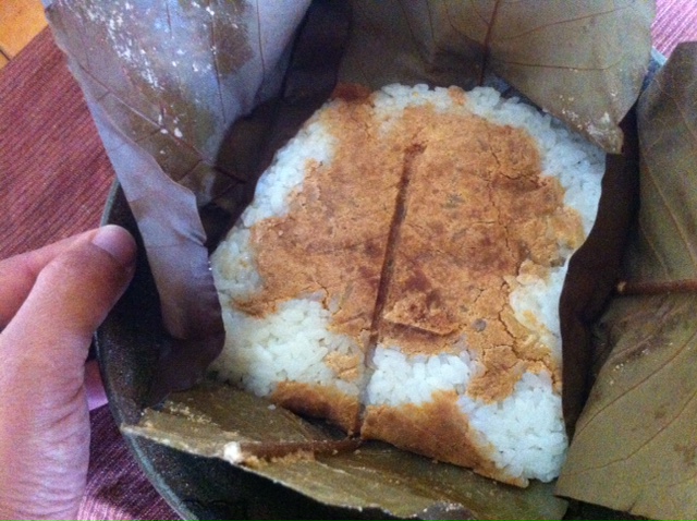 Using these special leaves you wrap rice with soy bean powder and sugar.