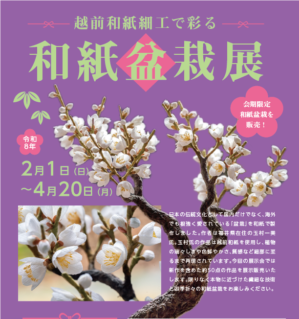 本特別展においては、実際に越前和紙を使用した折形の作品を展示し、折形の意味や、 折形と和紙の関係、折形に和紙をどのように使うか等について紹介。