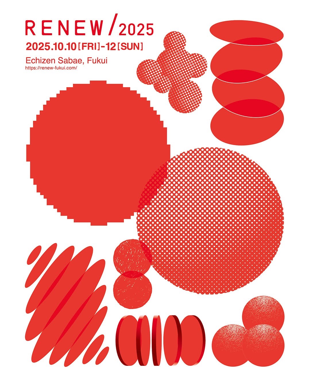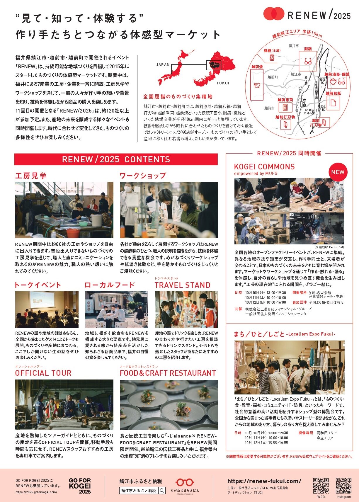「RENEW(リニュー)」は、福井県鯖江市・越前市・越前町で開催される、持続可能な地域づくりを目指した工房見学イベントです。会期中は、越前漆器・越前和紙・越前打刃物・越前箪笥・越前焼・眼鏡・繊維の7産地の工房・企業を一斉開放し、見学やワークショップを通じて、一般の人々が作り手の想いや背景を知り、技術を体験しながら商品の購入を楽しめます。また、RENEWでは狭義の産業観光だけにとどまらず、社会的意義の高い活動を行う全国各地のローカルプレーヤーが産地に集うマーケット「まち/ひと/しごと -Localism Expo Fukui-」も開催予定。国内最大規模となる一大イベントを、ぜひご堪能ください。