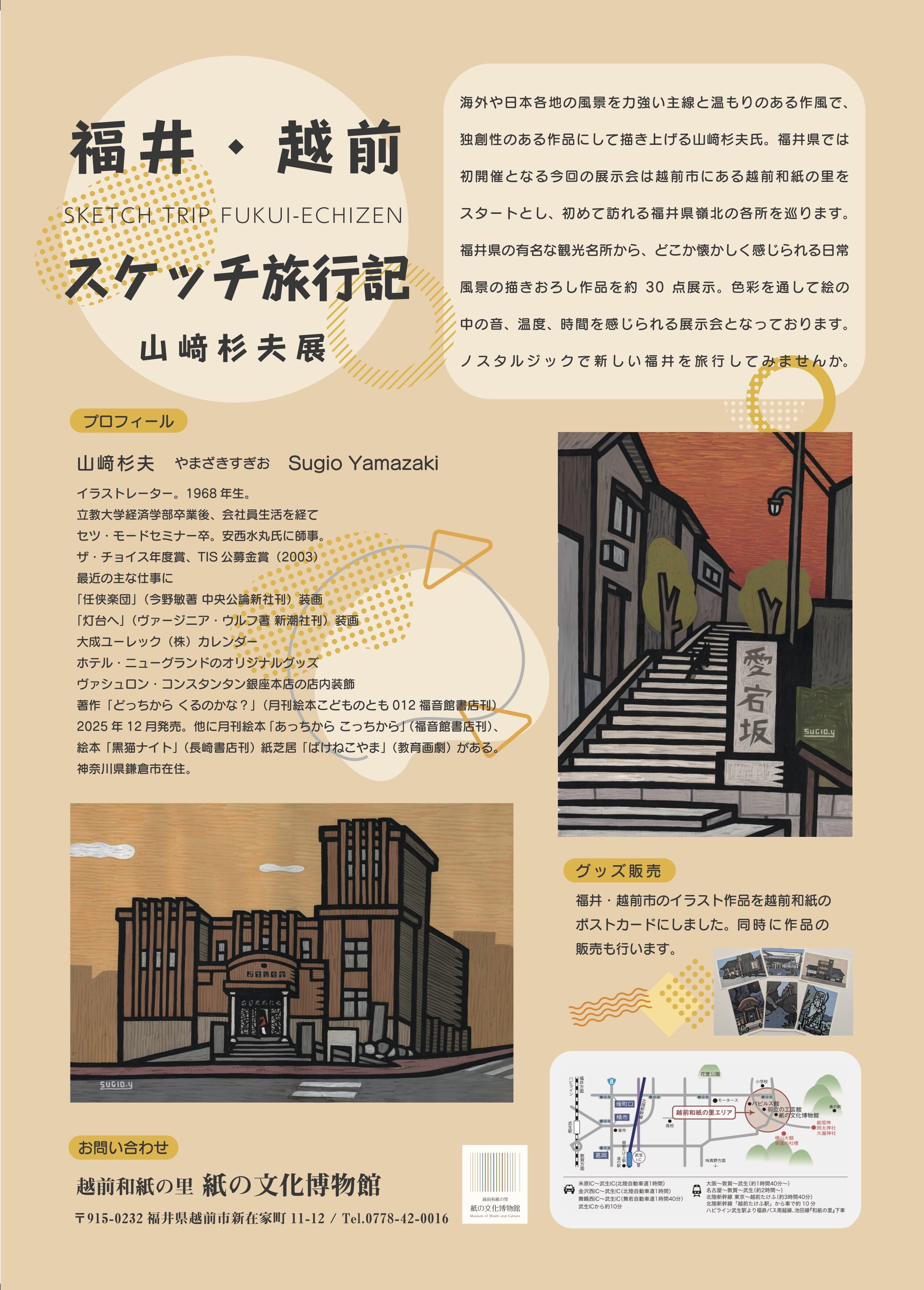 海外や日本各地を旅行し、その風景を風情と独創性のある作品にして描き上げる山﨑杉夫氏。今回の展示会は福井県では初開催となり、越前市にある越前和紙に里をはじめ、福井県嶺北の名所やどこか懐かしく感じられる日常風景の描き下ろし作品、これまでに手がけた作品を30点展示いたします。山﨑氏が魅力を感じた福井の風景や、福井の歴史と一緒にノスタルジックで新しい福井を旅行してみませんか。