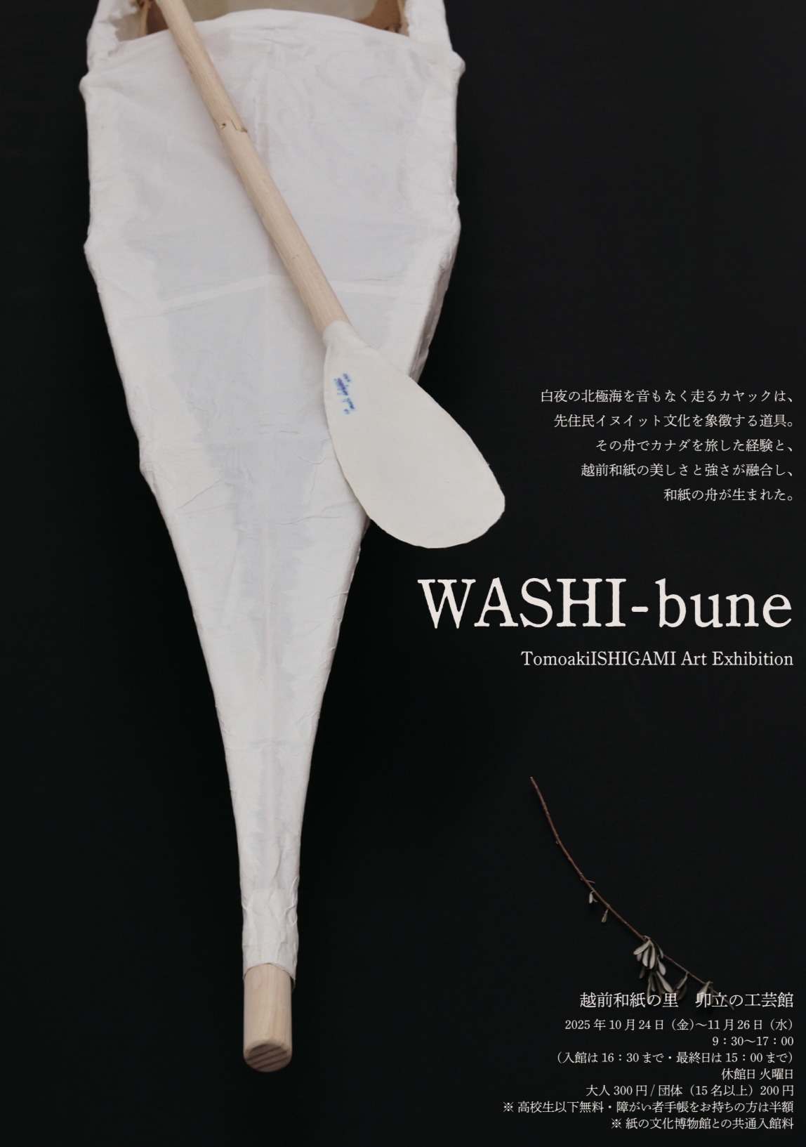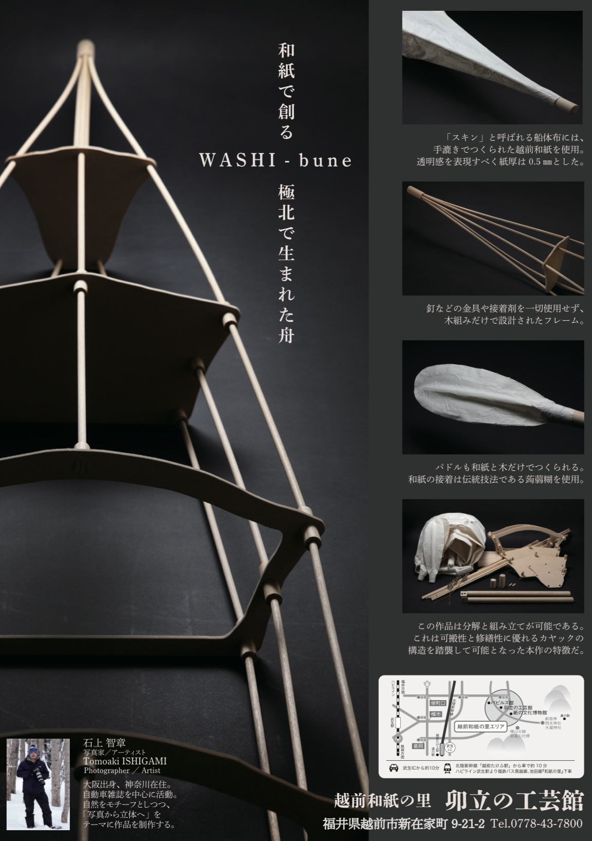 WASHI-bune [開催予定] 開催期間 2025年10月24日(金) ~ 2025年11月26日(水) 9:30〜17:00(入館は16:30まで・最終日は15:00まで) 休館日 火曜日 開催場所 越前和紙の里 卯立の工芸館 利用料金 大人300円 ※高校生以下無料・障がい者手帳をお持ちの方は半額 ※紙の文化博館との共通入館料 和紙で創る 極北で生まれた舟 写真家でありアーティストの石上智章氏が卯立の工芸館で漉かれた和紙を使用して制作した、全長5mの和紙の舟を展示します。 金具や合成接着剤を一切使用することなく、木組みと和紙だけで生まれた舟をご覧ください。 パンフレットはこちら