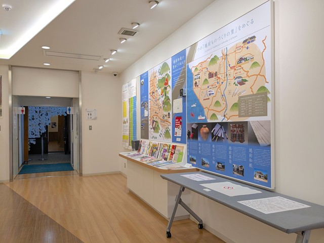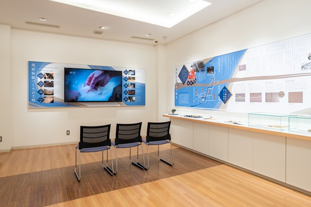 本館1階では、「世界に広がる越前和紙」「越前和紙の今昔」を映像とパネルで紹介しています。岡本川を中心に営む和紙産地五箇(不老、大滝、岩本、新在家、定友)とともに、紙祖神「川上御前」を祀る国の重要文化財『岡太神社・大瀧神社』や、産地の歴史と今をご覧いただけます。